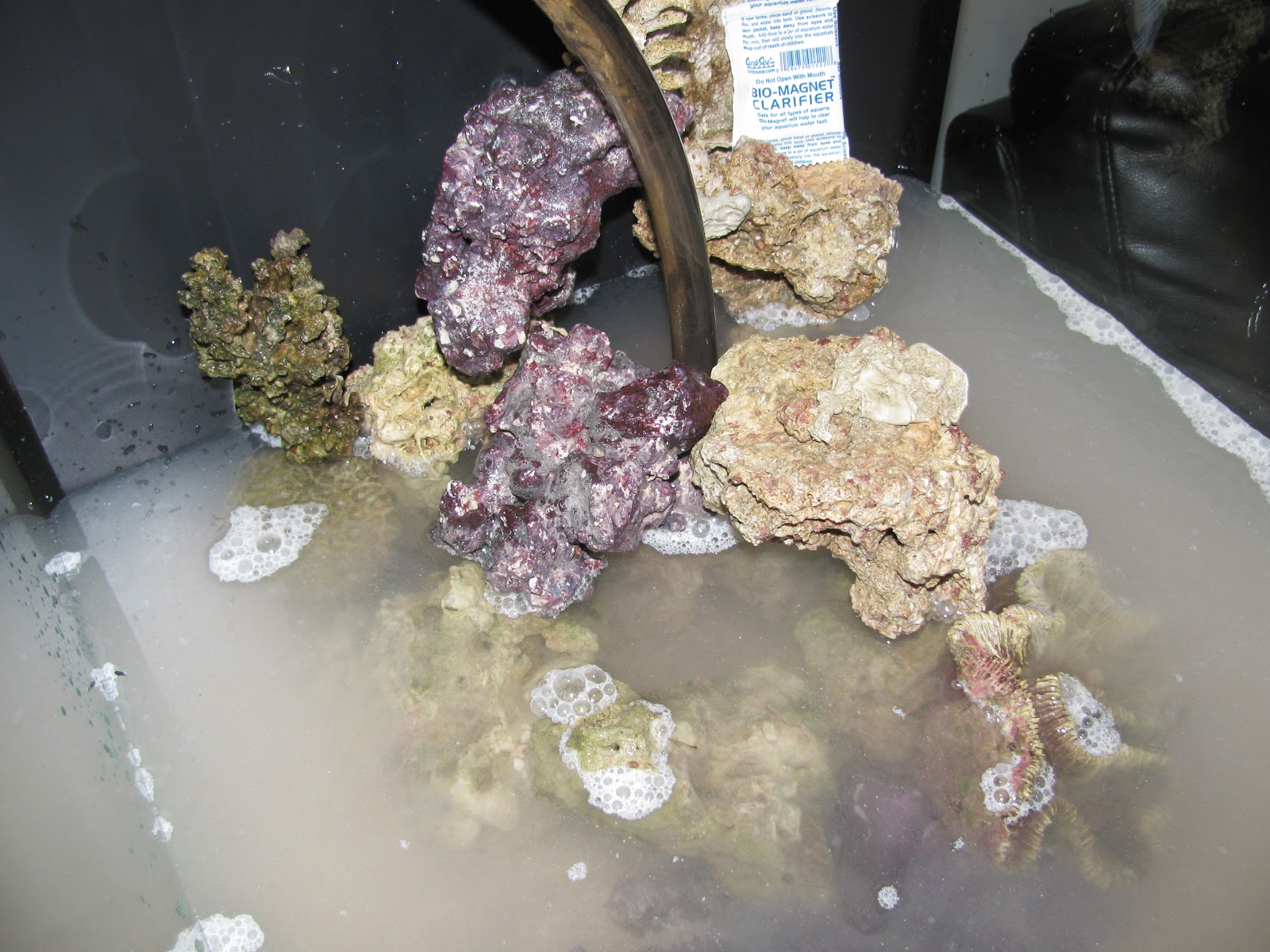 So i got my live rock and now it's time for some aquascaping. Before I added them in the tank I had them in a 5 gal Home Depot bucket dip in water, a powerhead to give it some flow, and a heater. So now it's the fun part. Here's where I get to be a kid and use my imagination.